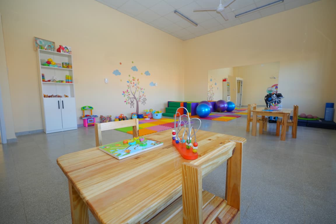 Además, posee sanitarios para niños y niñas, sanitario común y para discapacitados, estimulación, rehabilitación; un Área de Diagnóstico y Aprendizaje, que cuenta con un consultorio-enfermería, aulas, sanitario para niños, sanitario común, y sanitario para discapacitados.