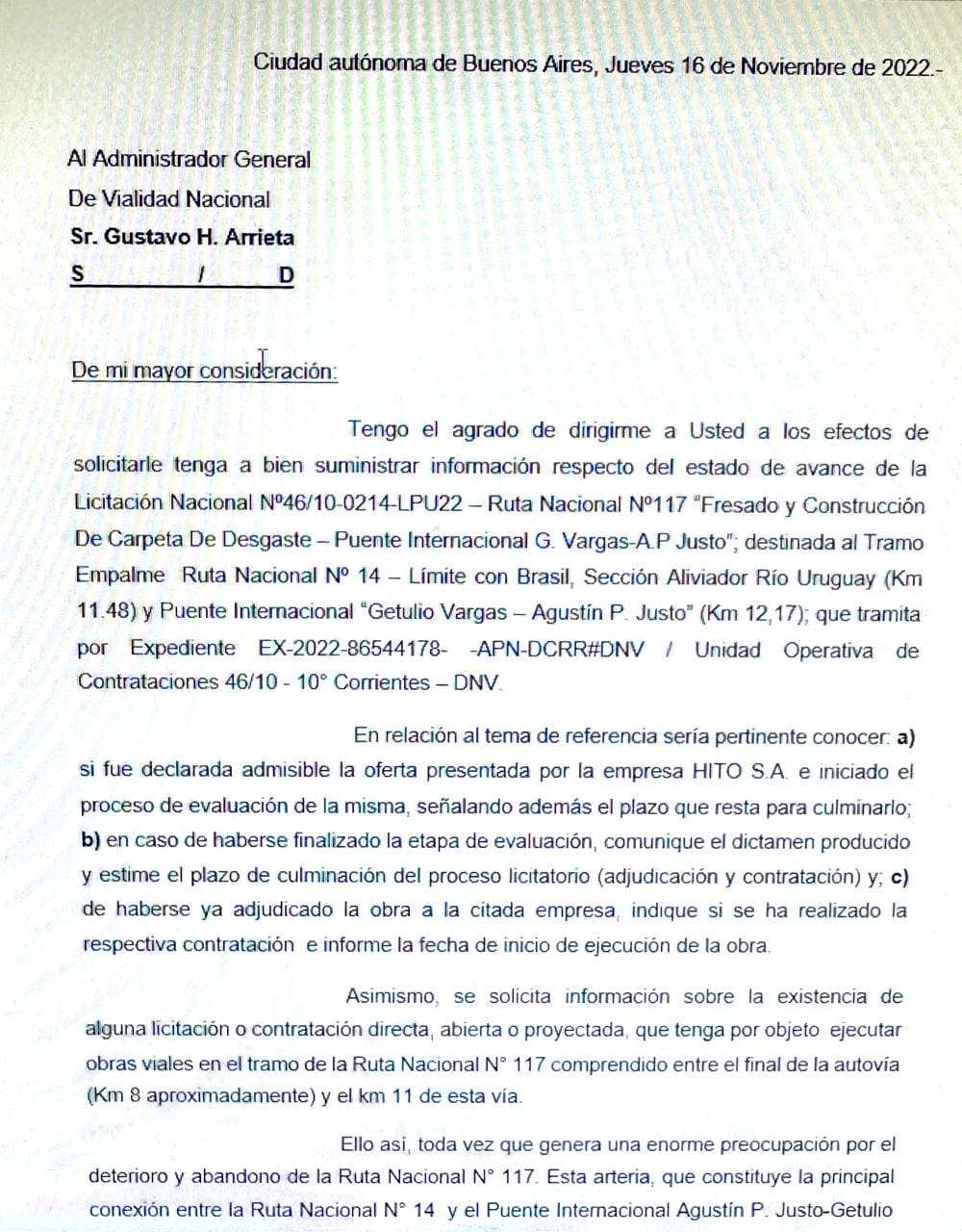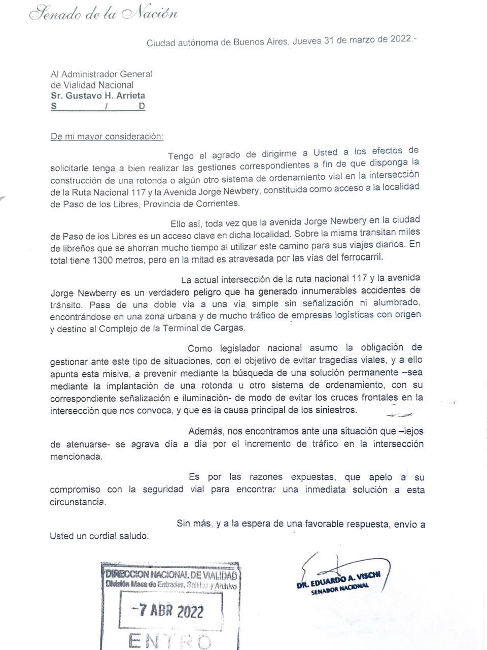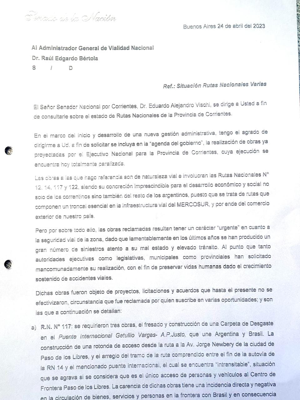 “Sumados a reclamos por las rutas nacionales, hice un pedido especial y urgente al Jefe de Gabinete @guillermo.francos en relación a la Ruta Nacional 117, en el acceso a Paso de los Libres, que está en mal estado, con mucho tránsito y sigue cobrándose vidas, y el Puente Internacional que une nuestra ciudad con Uruguayana”, escribía el miércoles pasado en su cuenta de Instagram el legislador Vischi, oriundo de Paso de los Libres.