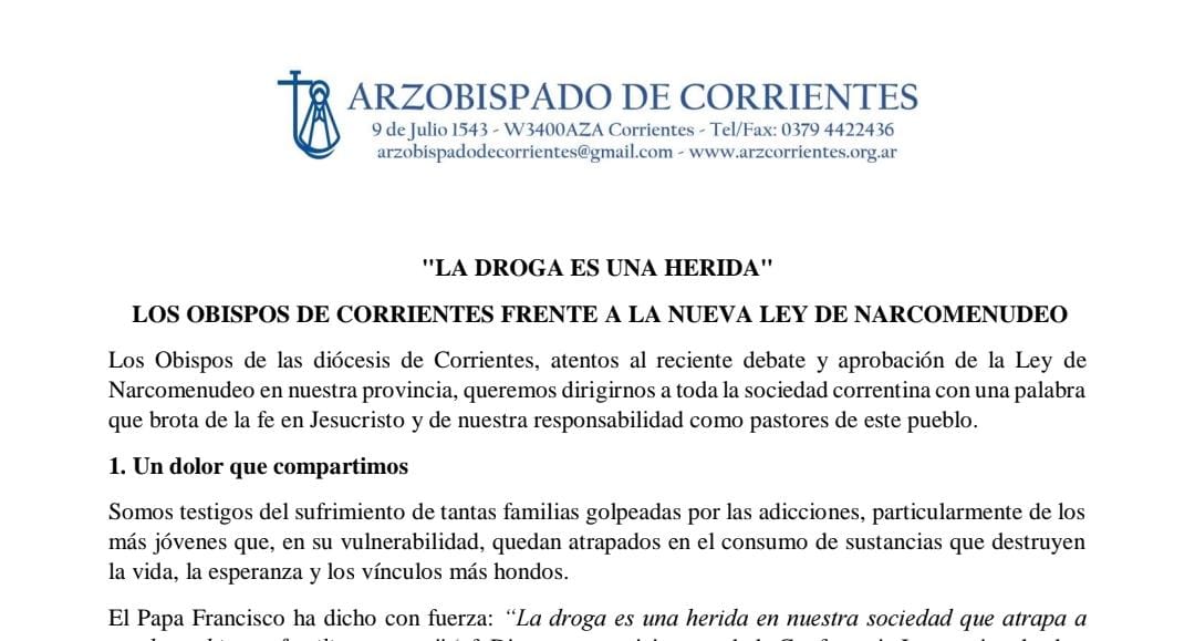 En un comunicado titulado “La droga es una herida”, los titulares de la Arquidiócesis de Corrientes y de las diócesis de Santo Tomé y Goya expresaron su preocupación por el flagelo de las drogas y llamaron a la sociedad a un “gran pacto por la vida”.