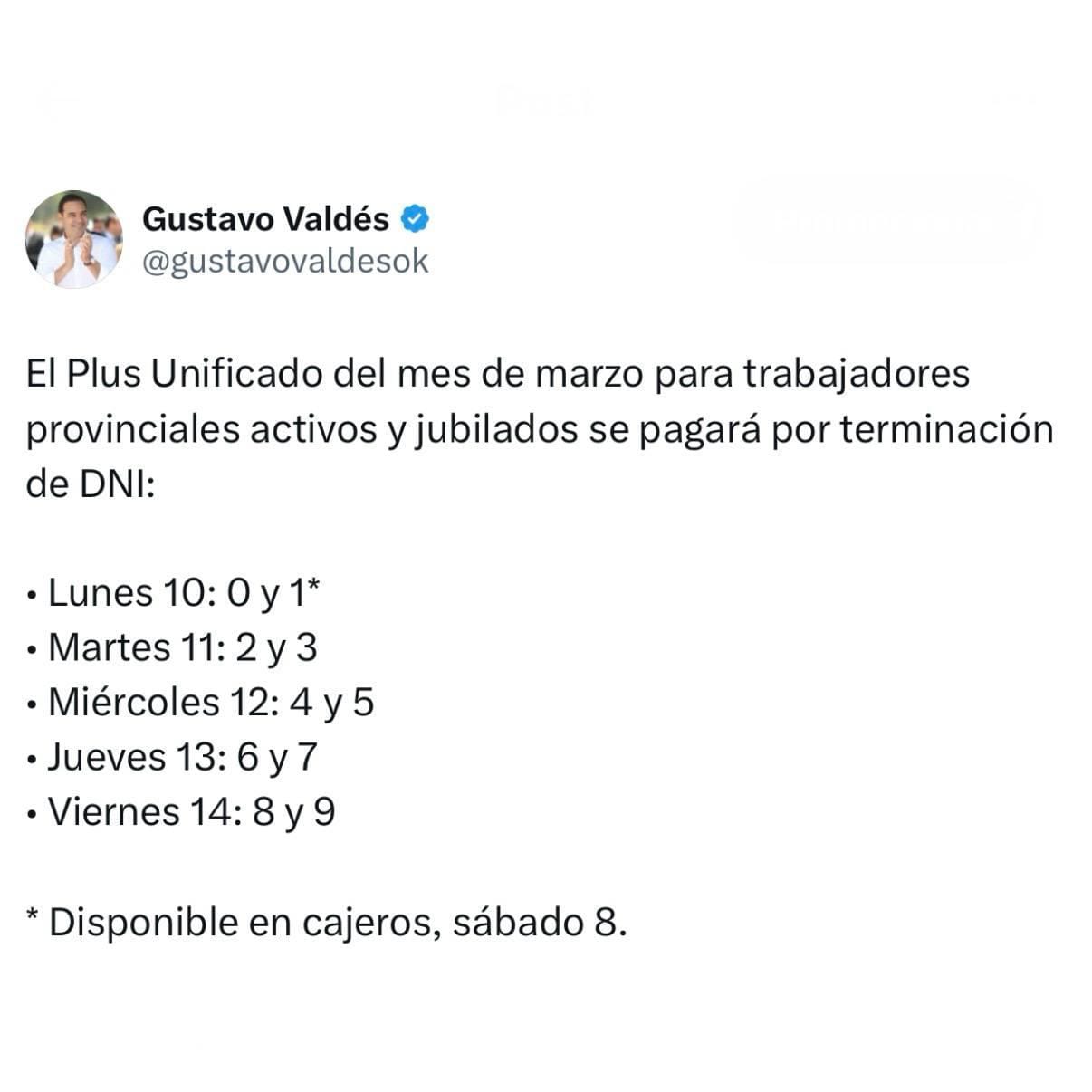 El gobernador de Corrientes, Gustavo Valdés, dio a conocer que el cronograma de pago del Adicional Remunerativo Mensual (Plus Unificado) correspondiente a marzo, de $55 mil por agente (activo, jubilado y pensionado) comienza hoy (lunes 1073) con el pago a los beneficiarios con Documento Nacional de Identidad terminados en 0 y 1. No obstante este tramo ya está disponible desde el sábado 8 a través de homebanking y de los cajeros automáticos habilitados por el Banco de Corrientes SA.