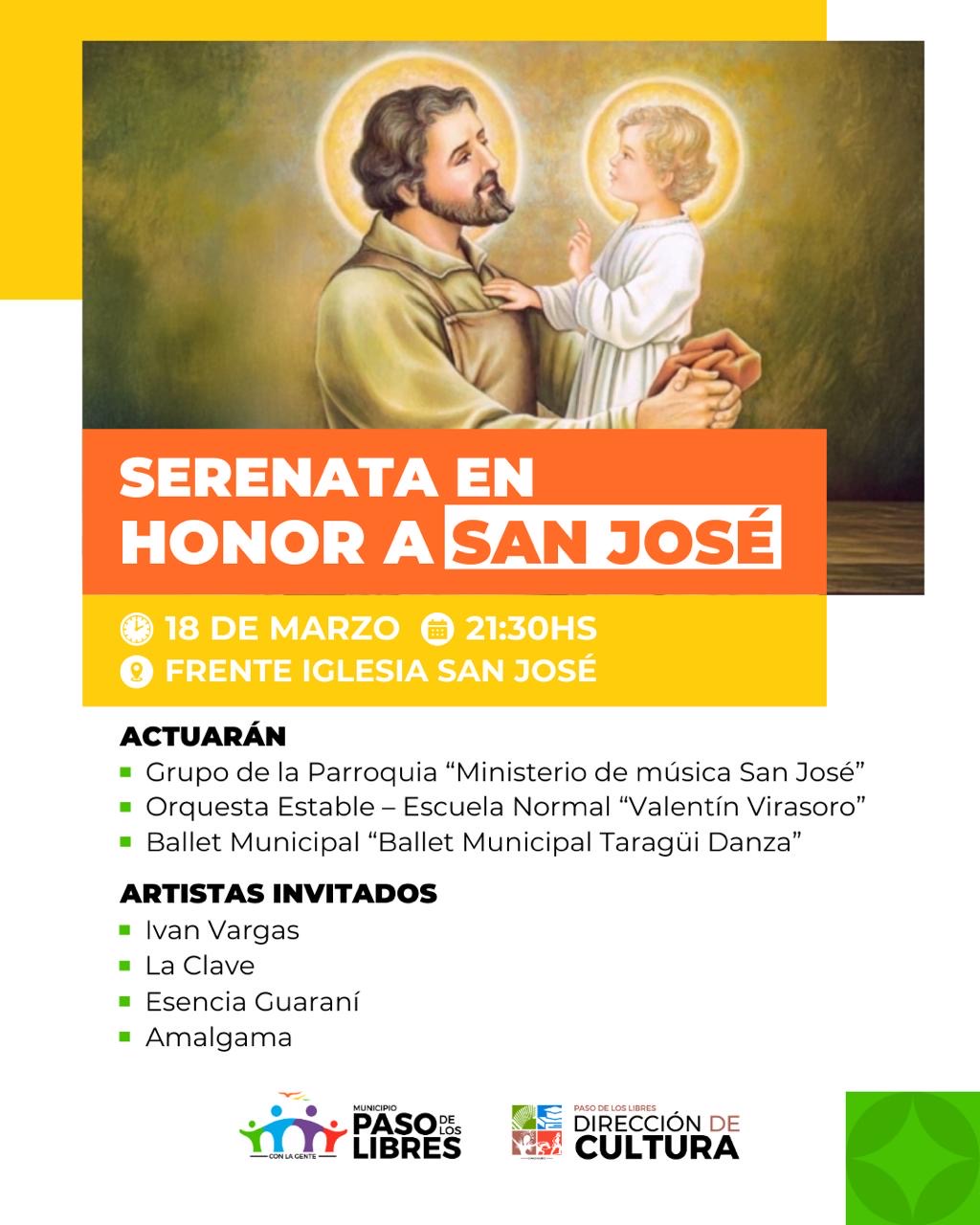 En este marco, hoy a las 21,30 horas, se realizará la Serenata en Honor a San José, como homenaje cultural, con la participación del Ministerio de Música San José, la Orquesta Estable de la Escuela Normal “Valentín Virasoro” y el Ballet Municipal “Taragüí Danza”.