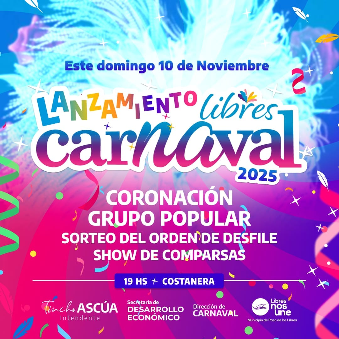 El domingo 10 de noviembre la ciudad de Paso de los Libres celebrará el esperado lanzamiento del Carnaval de la Frontera 2025. Evento que se realizará en la Costanera a partir de las 19 horas y que promete una noche llena de emociones para los amantes de la mayor fiesta popular libreña.