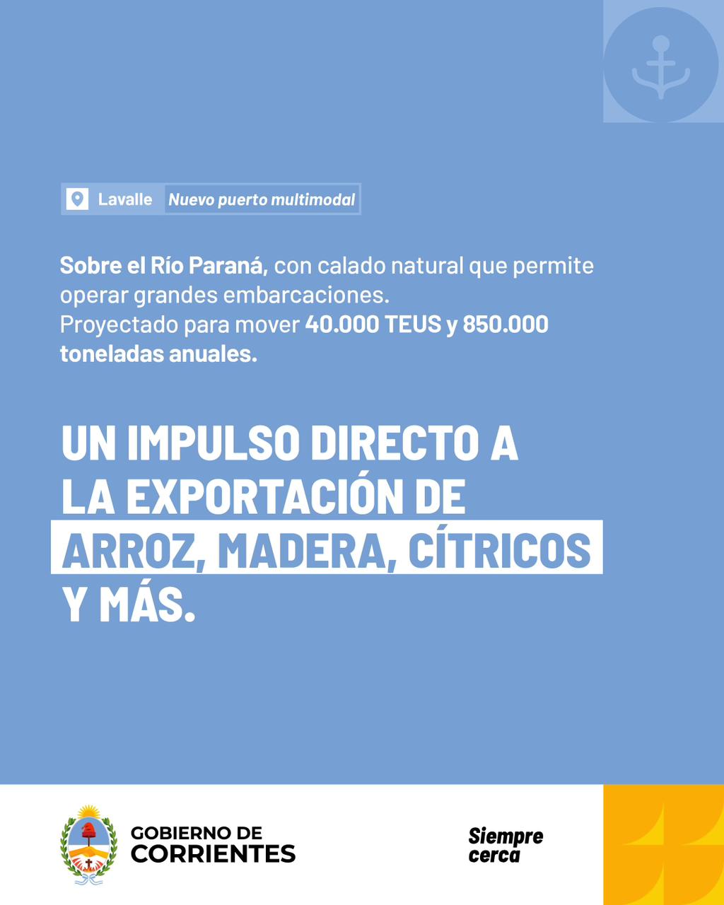 El desarrollo de Lavalle no es un hecho aislado, sino que forma parte de una estrategia de conectividad que incluye otros puntos claves como el puerto de Ituzaingó que actualmente es la obra portuaria más avanzada y ambiciosa de la provincia. Su ubicación estratégica cerca de la represa Yacyretá y su vinculación con el parque industrial lo posicionan como la principal salida para la industria forestal.
