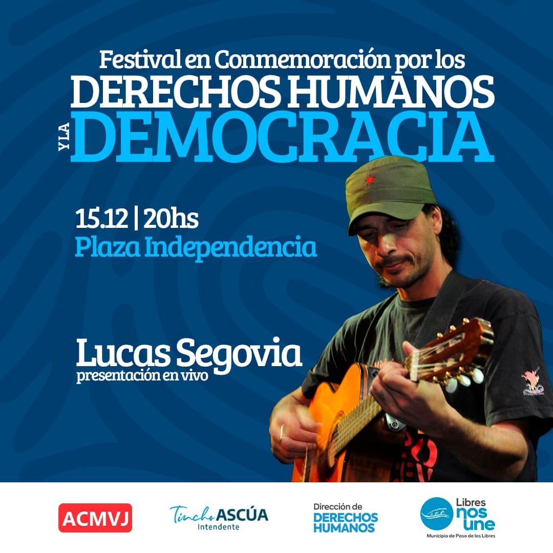 El próximo domingo (15 de diciembre) se realizará en Paso de los Libres el Festival en Conmemoración de los Derechos Humanos y la Democracia, un evento que contará con la destacada presentación del músico Lucas Segovia, reconocido por su trayectoria artística y su compromiso con la memoria histórica.