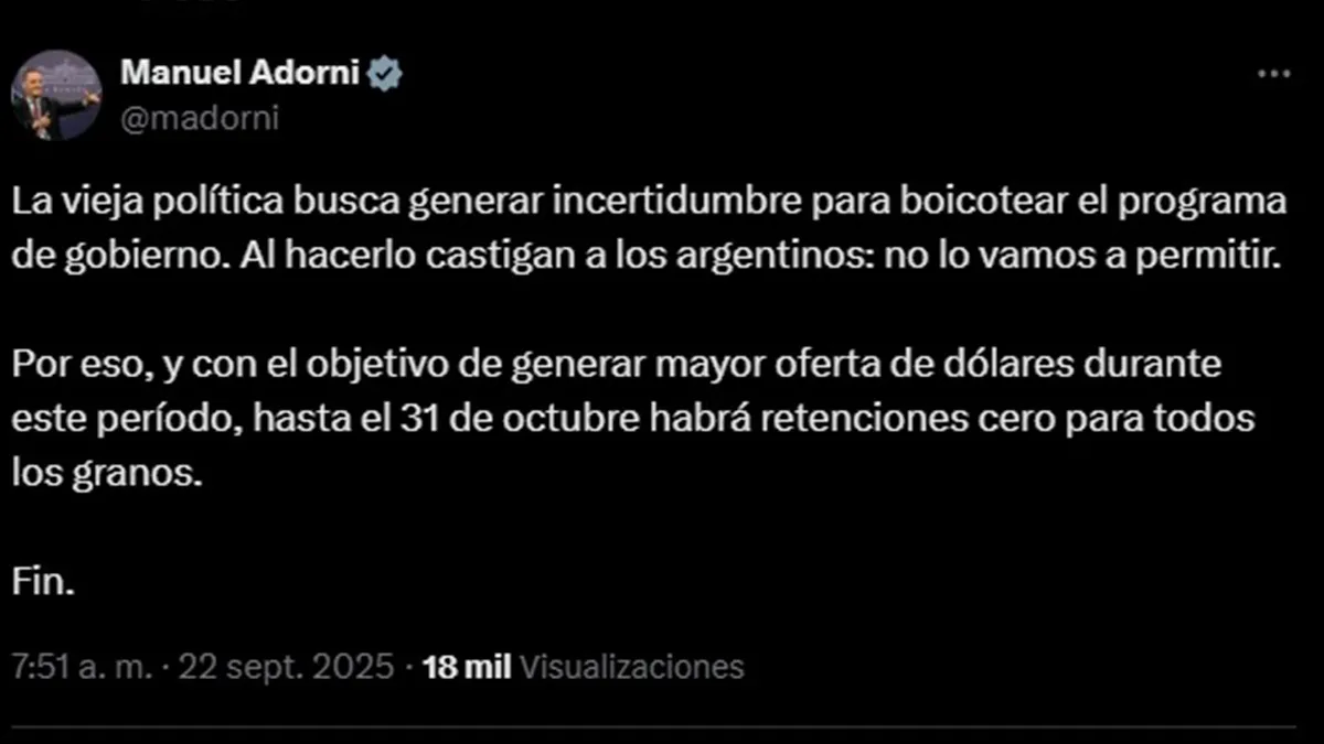 “La vieja política busca generar incertidumbre para boicotear el programa de gobierno. Al hacerlo, castigan a los argentinos. No lo vamos a permitir”, sostuvo Adorni en su cuenta de X. Minutos después, confirmó la iniciativa: “Por eso, y con el objetivo de generar mayor oferta de dólares durante este período, hasta el 31 de octubre habrá retenciones cero para todos los granos”.