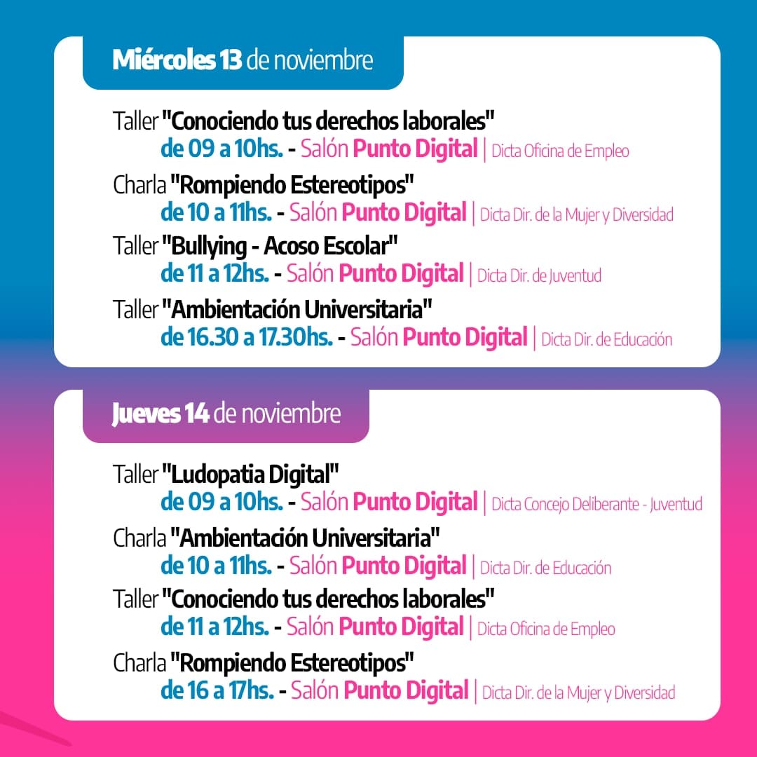 El jueves 14, las actividades se iniciarán a las 9 horas con el taller “Ludopatía Digital”, a cargo del Concejo Deliberante-Concejo de la Juventud. A las 10 se repetirá la charla “Ambientación Universitaria” y, a las 11, el taller “Conociendo tus derechos laborales”.