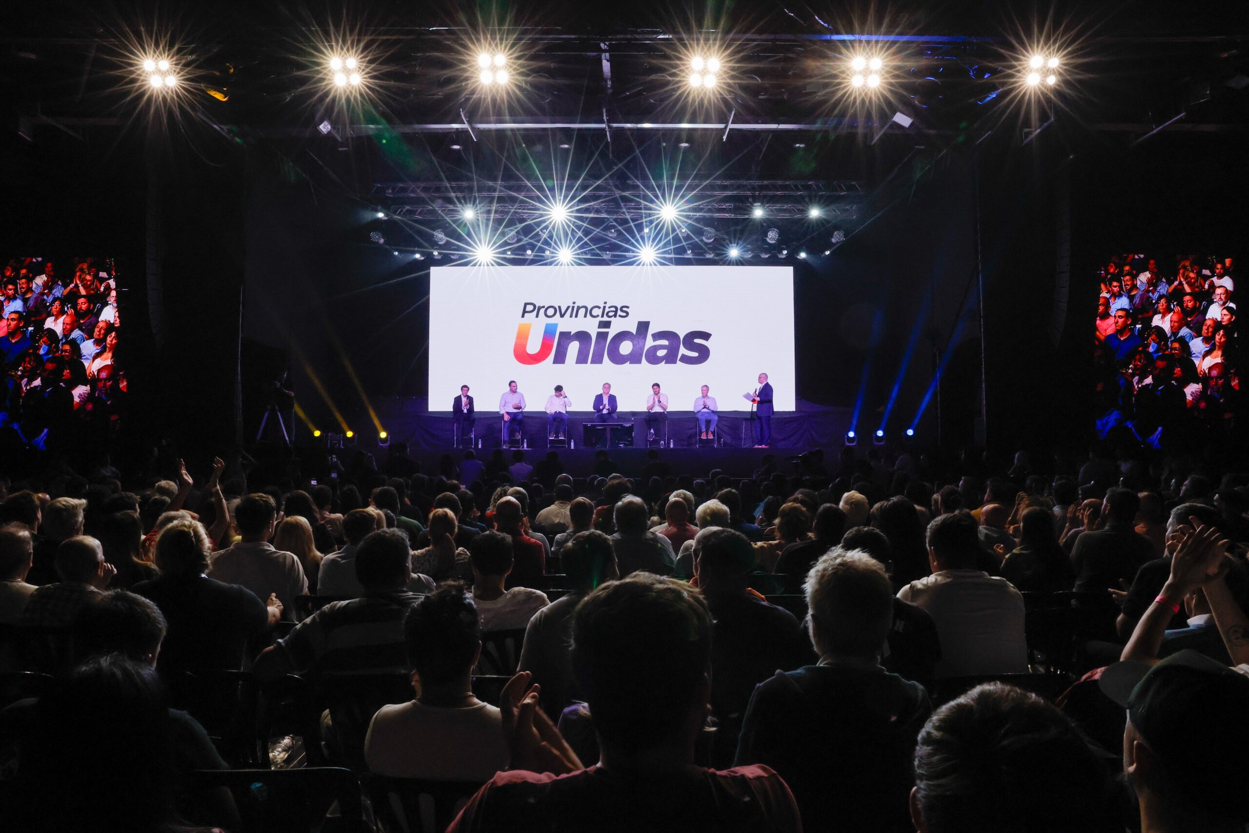 Seguidamente se invitó al escenario a los cinco gobernadores que conforman “Provincias Unidas”: por Corrientes, Gustavo Valdés; por Jujuy, Carlos Sadir; Chubut, Ignacio “Nacho” Torres; por Córdoba, Martín Llaryora; Santa Fe, Maximiliano Pullaro; y al ex gobernador de Córdoba y candidato a diputado nacional por esa provincia, Juan Schiaretti.