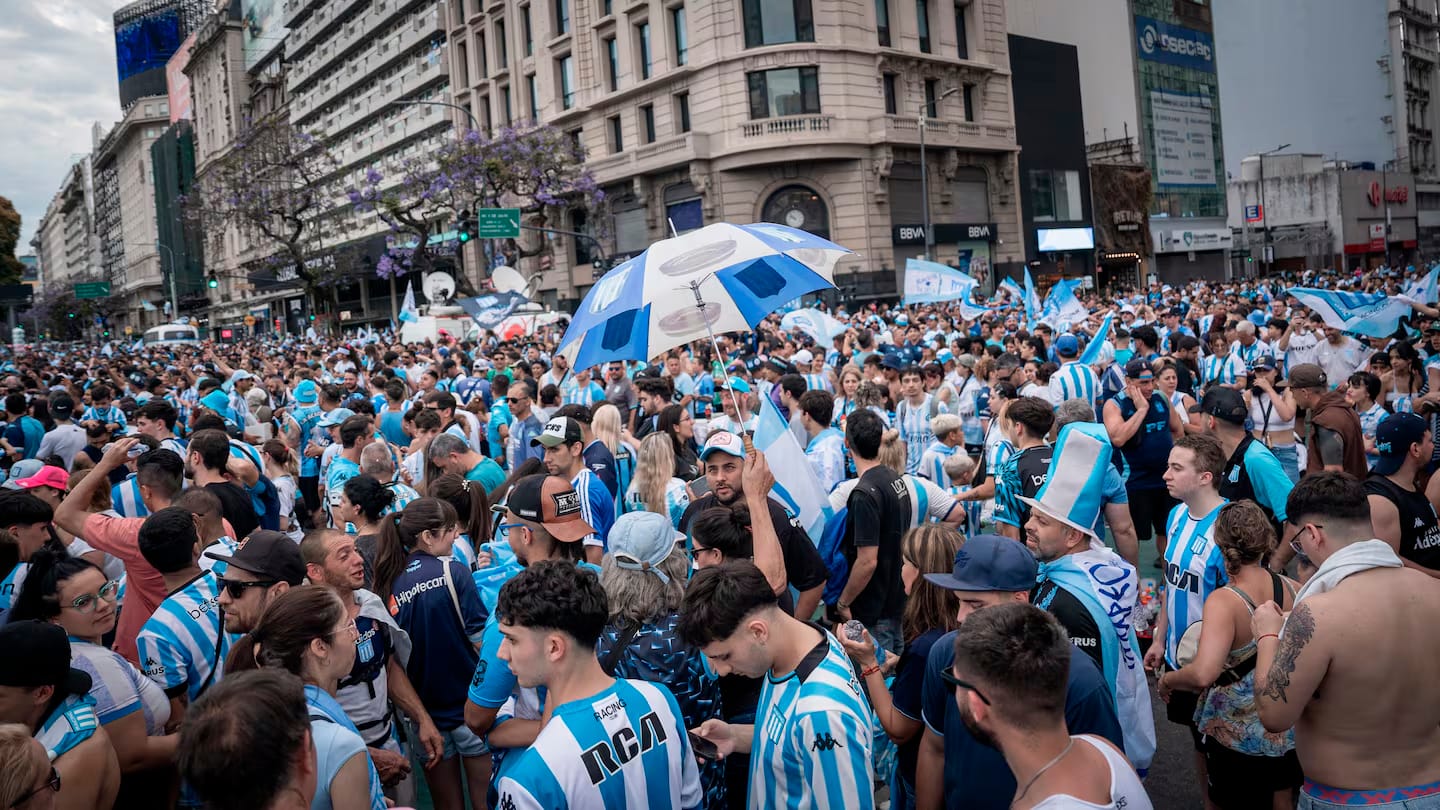 Miles de fanáticos se reunieron en el tradicional monumento de la Ciudad de Buenos Aires para recibir a los campeones. La Academia venció 3-1 a Cruzeiro el sábado en Paraguay y consiguió su cuarto título internacional.