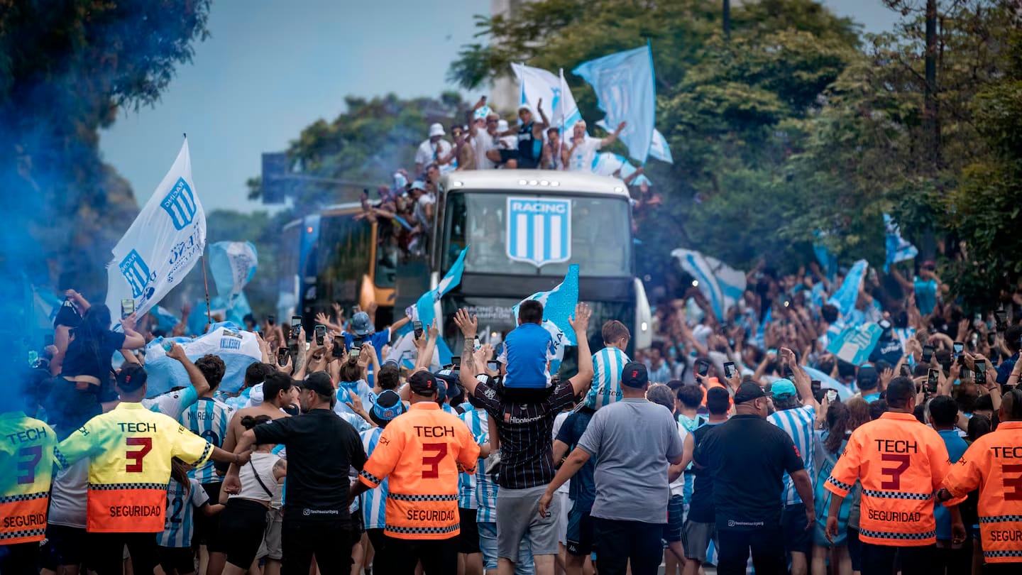 El plantel de Racing pasó la noche en la capital paraguaya y emprendió su regreso a Argentina este mediodía. La delegación aterrizó en el Aeropuerto Internacional de Ezeiza alrededor de las 17:00, donde una multitud de fanáticos esperó para recibir y festejar junto al equipo el ansiado título.