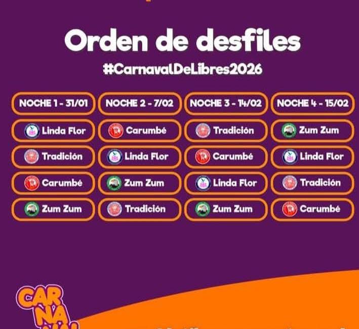 Durante la ceremonia fue presentada la nueva Comisión Organizadora y la Corte del Carnaval 2026. También se rindió homenaje a “Loro” Zapata, histórico Rey Momo del Carnaval libreño y se sorteó el orden de desfile de las comparsas para las 4 noches de corsos.