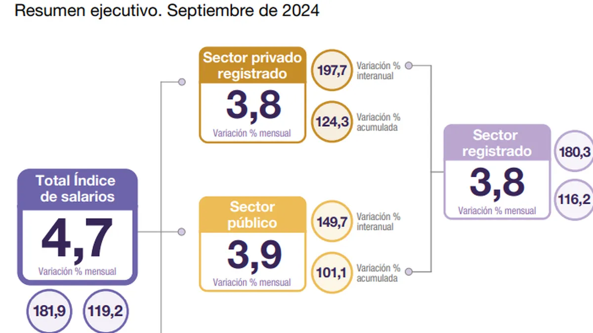 El crecimiento de los sueldos durante septiembre se explicó por los incrementos de 3,8% en el sector privado registrado, de 3,9% en el sector público y de 10,4% en el sector privado no registrado. Entre enero y septiembre, el promedio de los salarios creció 119,2% y quedó por encima de la inflación acumulada en esos nueve meses acumuló un alza de 101,6%.
