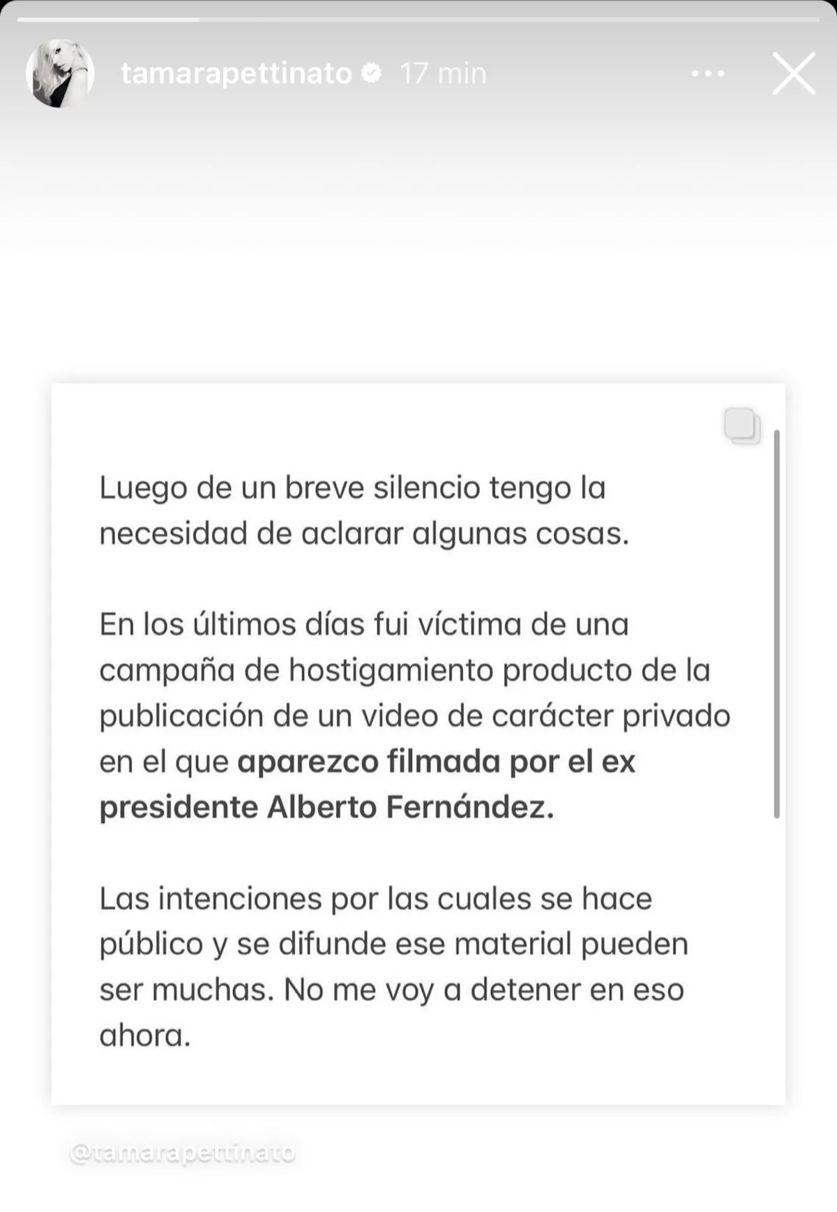 Luego del revuelo que generó su video en el despacho de Alberto Fernández, Tamara Pettinato decidió finalmente emitir un comunicado al respecto.