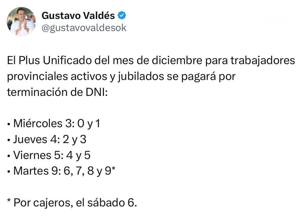 A través de sus cuentas en redes sociales, gustavovaldesok, el Primer Mandatario correntino, Gustavo Valdés, anunció el comienzo, desde el miércoles 3 de diciembre, del cronograma de pago del Adicional Remunerativo Mensual (Plus Unificado) correspondiente a este mes.