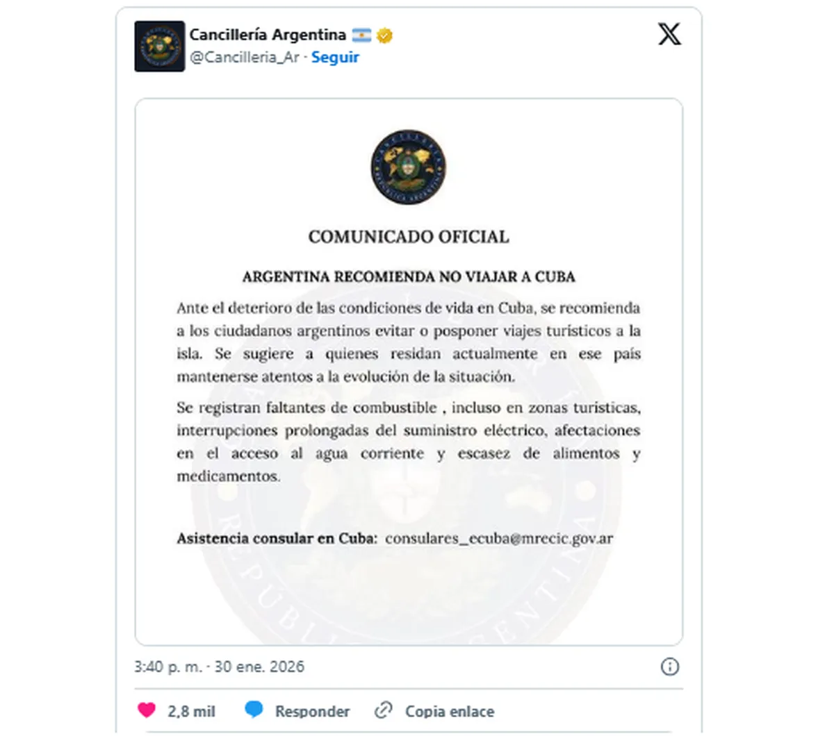 En ese contexto, el Gobierno argentino emitió el viernes un comunicado oficial en el que recomendó evitar viajes a Cuba, al advertir sobre el deterioro de las condiciones de vida. “Se recomienda a los ciudadanos argentinos evitar o posponer viajes turísticos a la isla. Quienes residan actualmente en el país deben mantenerse atentos a la evolución de la situación”, señaló la Cancillería, que justificó la decisión en la profundización de la crisis económica y social.