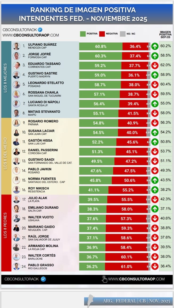 Los tres intendentes mejor valorados del mes de noviembre de 2025 por sus vecinos son, en primer lugar, Ulpiano Suárez (Mendoza Capital) con un 60,8% de imagen positiva, seguido por Jorge Jofré (Formosa Capital) con un 60,3%, y en tercer lugar Eduardo Tassano (Corrientes Capital) con un 59,2% de aprobación.
