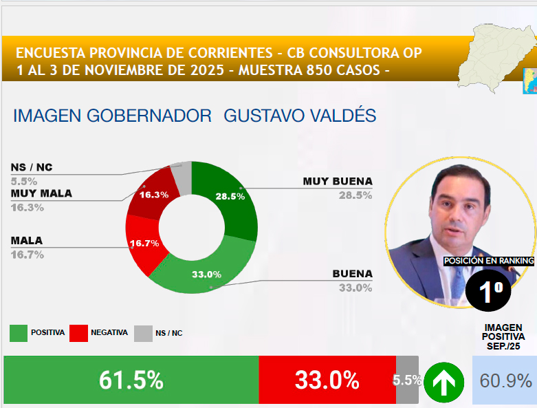 De acuerdo al informe mensual de “CBC Consultora”, los tres gobernadores mejor valorados de este mes por sus comprovincianos son Gustavo Valdés (Corrientes), quien lidera con un 61,5% de imagen positiva, seguido por Claudio Poggi (San Luis) con un 60,4%, y en tercer lugar Osvaldo Jaldo (Tucumán) con un 59,8%.