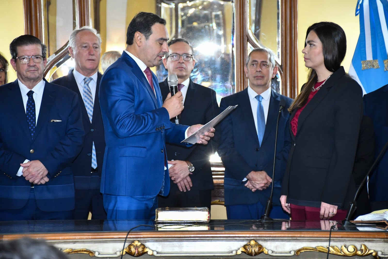 Luego, el escribano mayor de Gobierno, Rolando Battilana, a cargo de la fiscalización del acto, leyó el acta correspondiente, tras lo cual el gobernador Valdés tomó juramento de ley de posesión del cargo a la flamante titular de la Cartera.