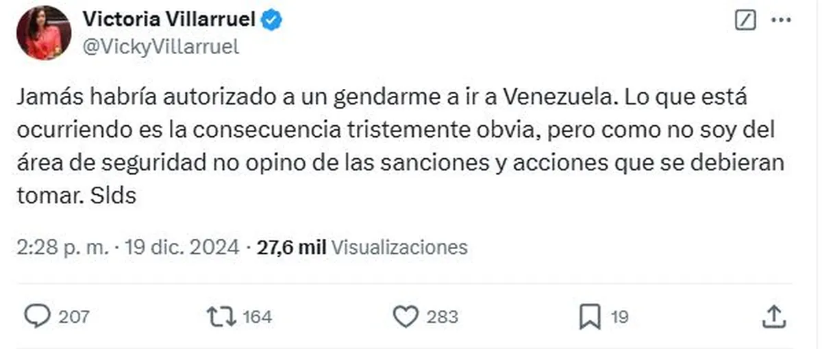 “Jamás habría autorizado a un gendarme a ir a Venezuela. Lo que está ocurriendo es la consecuencia tristemente obvia, pero como no soy del área de seguridad no opino de las sanciones y acciones que se debieran tomar”, expresó Villarruel en su cuenta de la red social X.