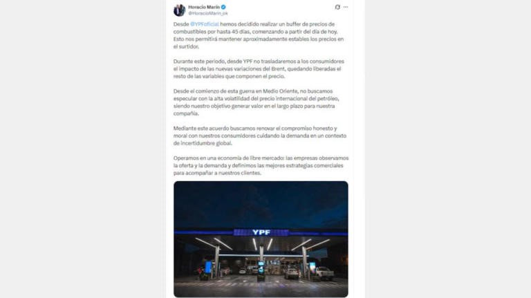 Horacio Marín, presidente de YPF, escribió en su cuenta de X: “Desde YPF hemos decidido realizar un buffer de precios de combustibles por hasta 45 días, comenzando a partir del día de hoy. Esto nos permitirá mantener aproximadamente estables los precios en el surtidor”.